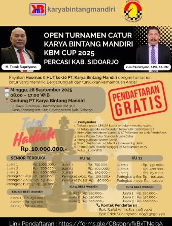 Sidoarjo – Dalam rangka memperingati Hari Olahraga Nasional (Haornas) sekaligus HUT ke-20, PT. Karya Bintang Mandiri menggelar Open Tournament Catur KBM Cup 2025 pada Minggu (28/9/2025).